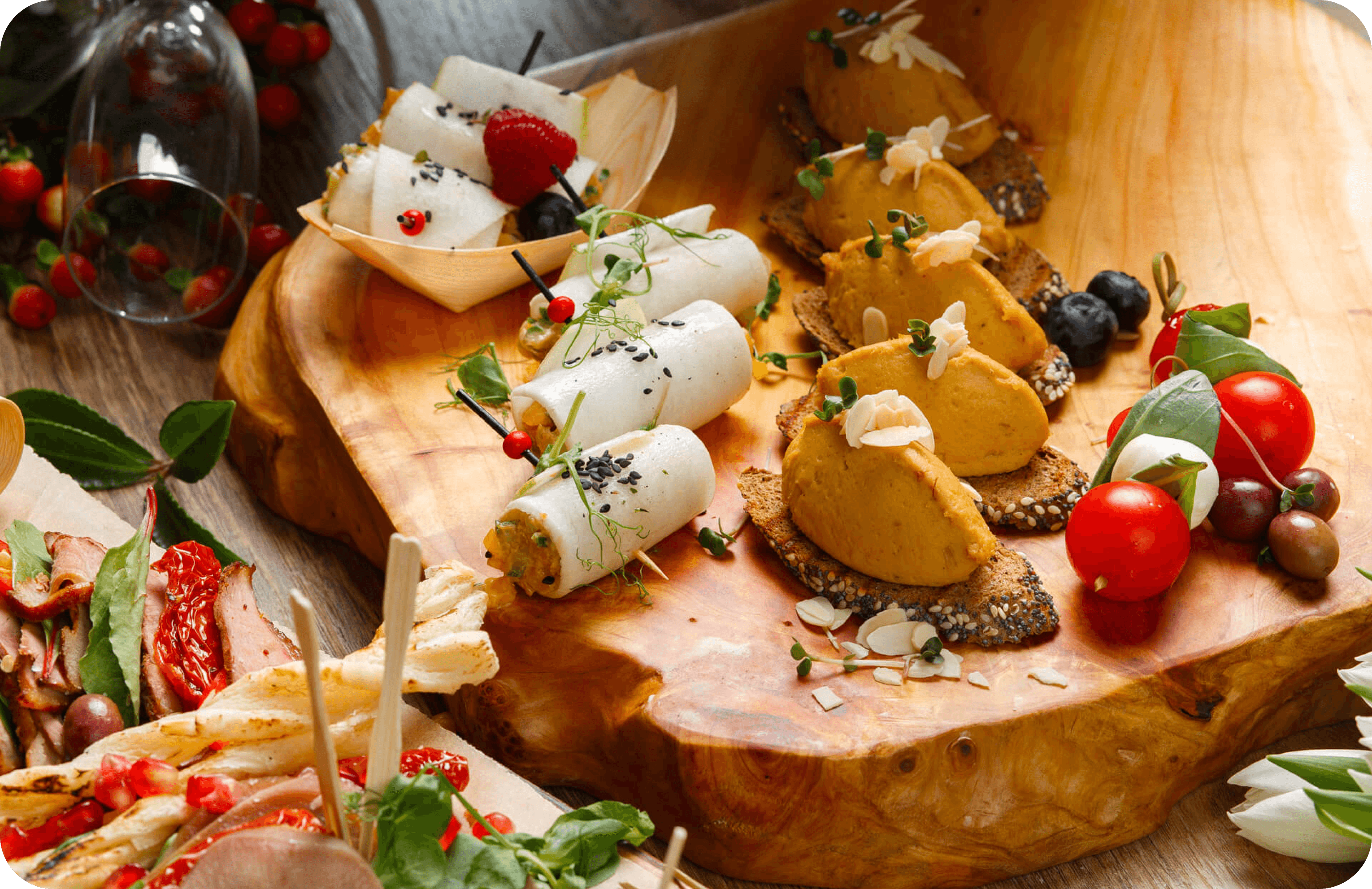 Организуем кейтеринг там, где нужно вам. Стильная подача, безупречный сервис и гастрономия высокого уровня — в любой локации.